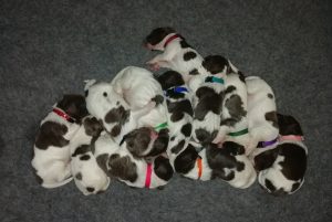 Lupin went into labour on the 10th November at 6.55pm, the first few were pushed out pronto, she was ready to burst her tummy as tight as a drum. Then it slowed down and the final puppy was born at 3.30am on the 11th. The perfect dozen, just as she had done for her first litter. She is the most amazing mother, genetically made to be the ‘Alpha’ dog, her behaviour one of a dominant dog designed to be responsible for the rearing of the next generation. This time round we are both more practiced and a whole lot more relaxed about the procedure. I have learnt properly about dog language and can read her like a book, I know when when she needs space and when she needs to play, when she needs to go out and when she needs more food. The first few days she is ultra protective, carefully feeding, cleaning and making sure they are warm. As Jan Fennell told me she is able to cleverly divide them into groups so that only half feed at a time. When she needs a rest she lies protecting her stomach and they sleep. It is the most heart warming unbelievable act of nature to be a witness too.